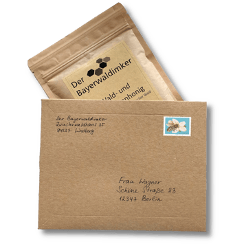 Nur durch ein perfektes Zusammenspiel von Gewicht und Größe ist es möglich Honig günstig als Briefsendung (Großbrief für 1,80 €) zu versenden. Daher lassen wir nun eigens für die speziellen Anforderungen des Honigversands Beutel produzieren - aluminiumfrei und umweltfreundlich.